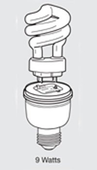 Description: TCP 16009L35K 9W Two Piece Springlamp Compact Fluorescent Light Bulb - 9W TCX SPRING HPF 35K - Long life compact fluorescent light bulb - Use anywhere a standard incandescent is used - Lasts 7 years, based on 4 hours use per day - Replace less often, ideal for hard to reach places - 10,000 hour average rated life - Medium base - 50,000 hour average rated ballast life - Ideal for table and floor lamps, ceiling fixtures and closet lights - Quick run up time - Instant start, flicker free - Lower maintenance and labor costs for lamp replacements