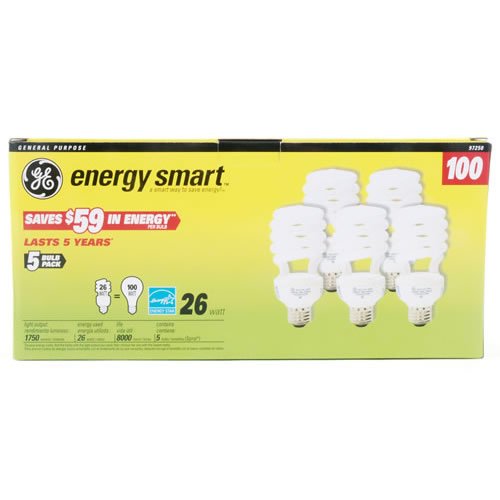 A smart way to save energy. The 26 watt compact fluorescent light bulb replaces 100 Watt bulbs. Lasts 5 years.